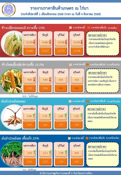 รายงานราคาสินเค้าเกษตร ราคา ณ ไร่นา ประจำสัปดาห์ที่ 4 เดือนกันยายน 2568 สำนักงานเศรษฐกิจการเกษตรที่ 53 สัปดาห์ ago1 สัปดาห์ ago 0