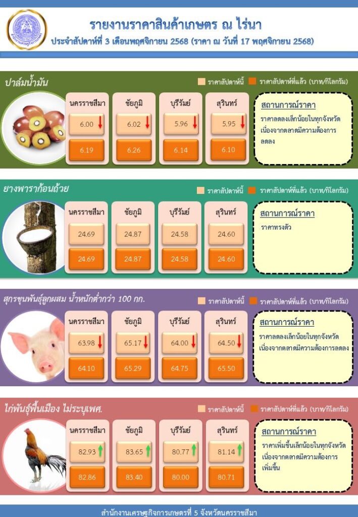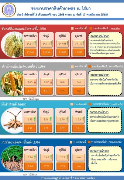 รายงานราคาสินเค้าเกษตร ราคา ณ ไร่นา ประจำสัปดาห์ที่ 4 เดือนพฤศจิกายน 2568 สำนักงานเศรษฐกิจการเกษตรที่ 53 สัปดาห์ ago2 สัปดาห์ ago 0